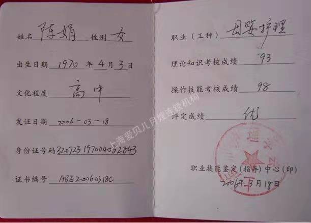 陈阿姨,从事月嫂16年多,来公司元老级人物了,带过100多个新生儿宝宝,,有带过无数对双胞胎,早产宝宝,有着丰富的育儿经验,专业技术过硬,对产妇擅长开奶,护理细心,贴心,跟客户家人相处融洽,客户推荐指数五颗星,好评率百分百,值得信赖!